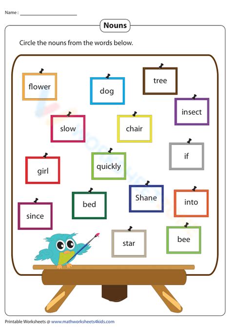 Identifying Nouns Worksheets. This worksheet has a list of nouns. From a physical object to an abstract idea, help little ones learn to quickly.