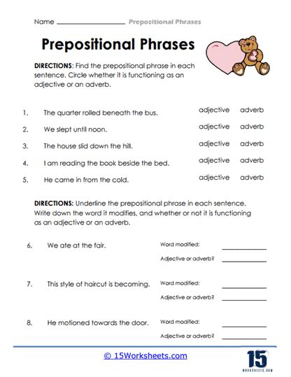 Identifying Prepositional Phrases Worksheets. Web this worksheet describes how prepositions usually introduce a phrase that has several parts: In these worksheets students identify prepositional clauses.